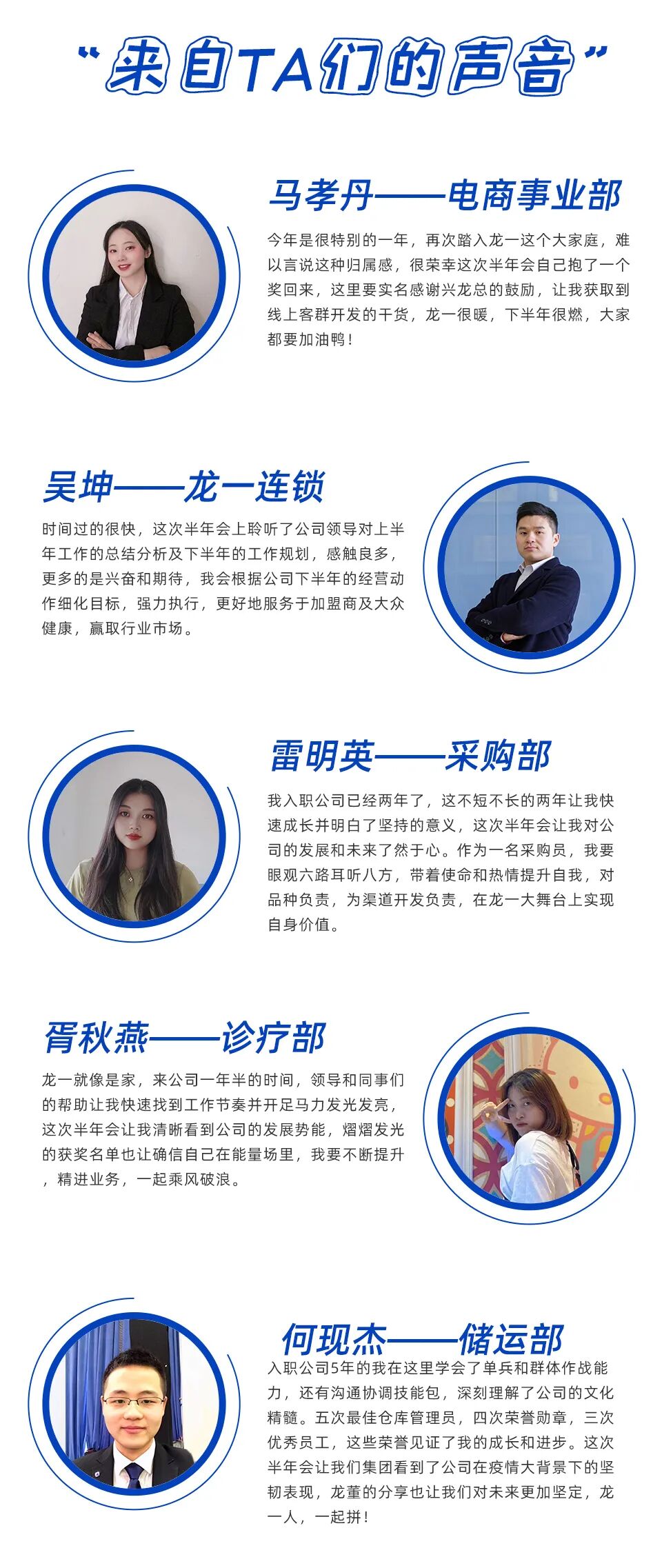 “感谢各位龙一将士在上半年和疫情期间的努力付出,我们的服务、模式、资源等种种要素在变化中不断成长和进化,军队文化是龙一医药的核心文化,未来我们将在持续做好业务经营的基础上,将军队文化贯穿始终,以高效率、高品质服务广大客户。”